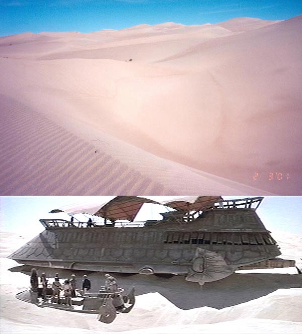 | The Return of the Jedi scenes with the battle at Jabba's Sail Barge above the Sarlacc Pit were filmed in Buttercup Valley, CA. The crew stayed nearby in Yuma, AZ at Stardust Motor Resort Motel which has since been replaced by a Fry's grocery store. |
